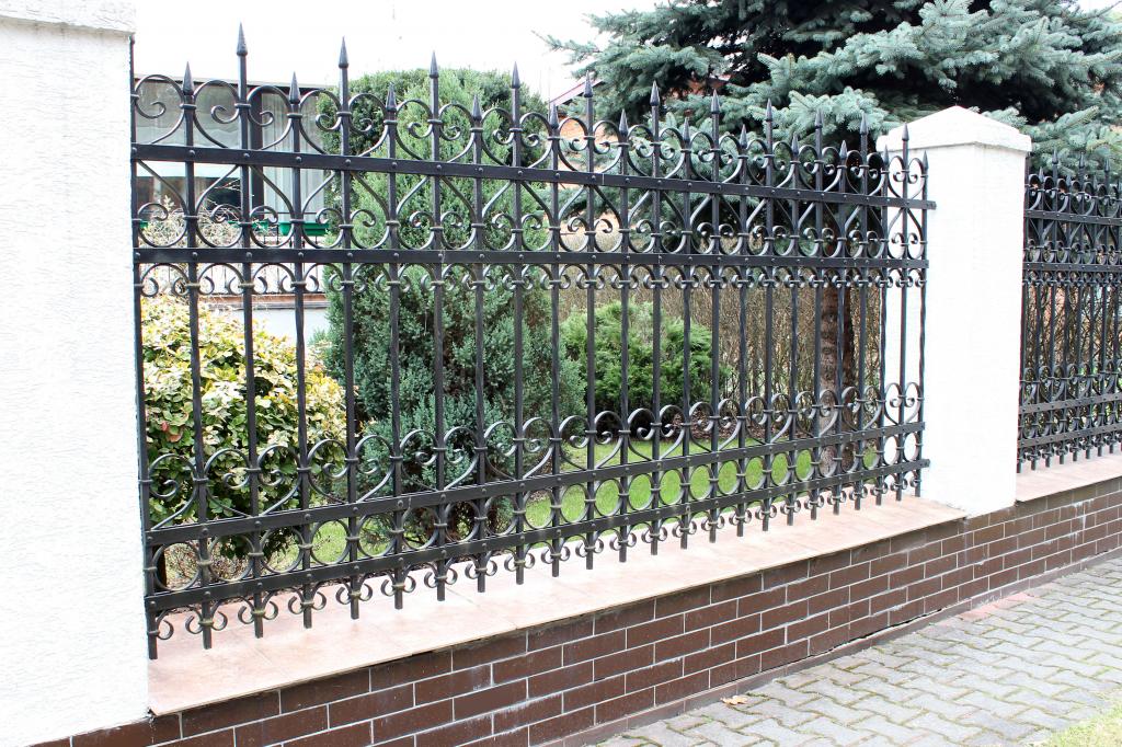 Ogrodzenie wykonano z pręta kw. 14x14, płaskownik 40x5, ozdoby: płaskownik 14x5. Wykonany metodą nitowania, pomalowany w kolorze RAL 9005 - czarny i ocynkowany ogniowo.
