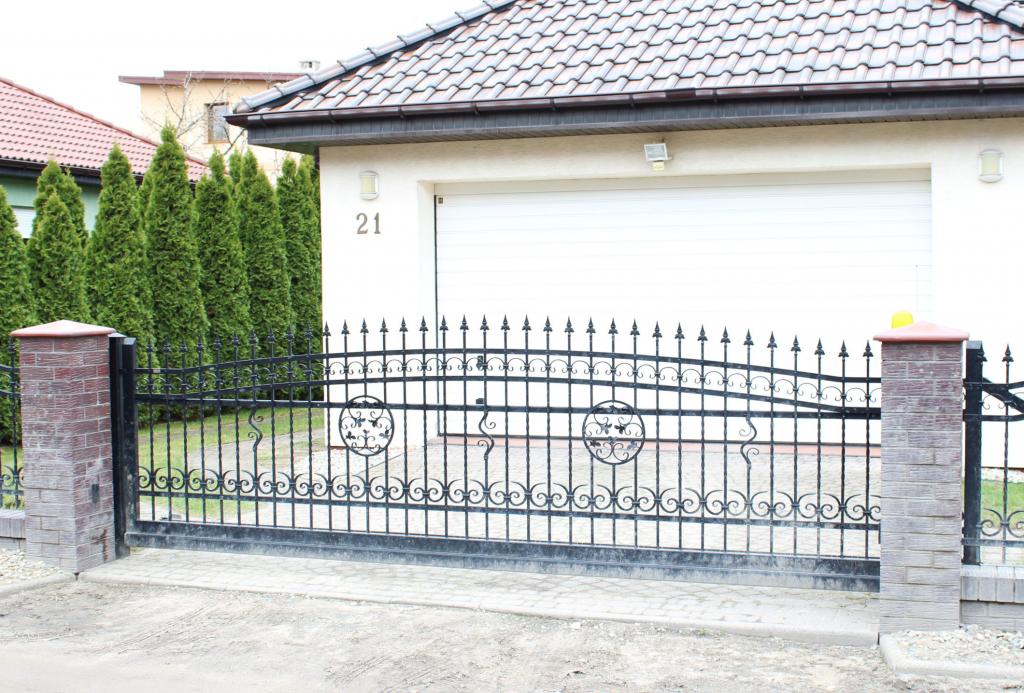 Ogrodzenie wykonano z pręta kw. 14x14, płaskownik 30x5, ozdoby: elementy rozkuwane z pręta 12x12, ozdoba centralna wg. katalogu. Wykonany metodą nitowania, pomalowany w kolorze RAL 9005 – czarny i ocynkowany ogniowo.