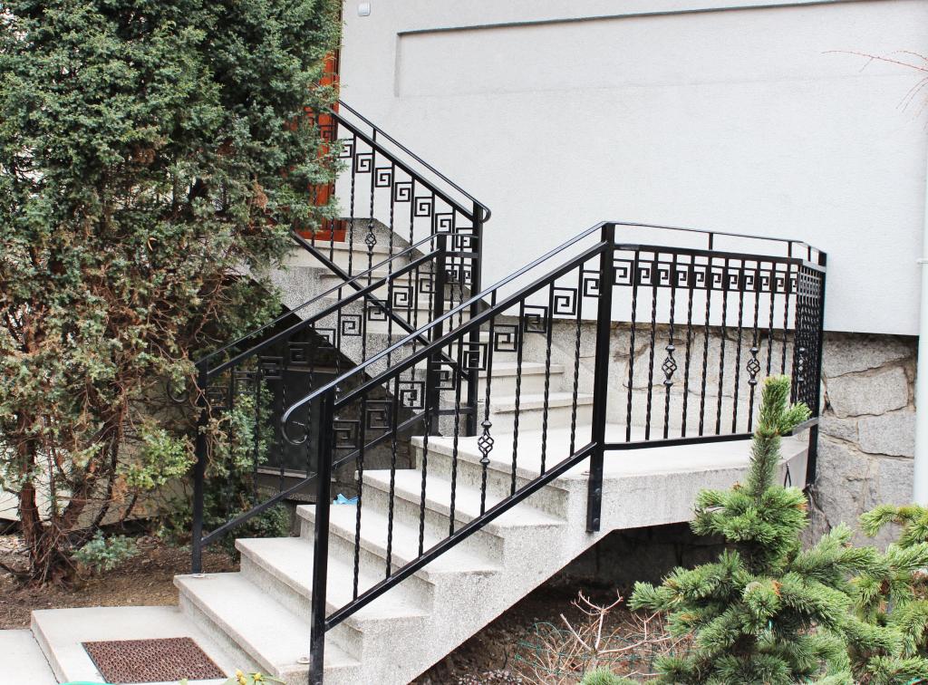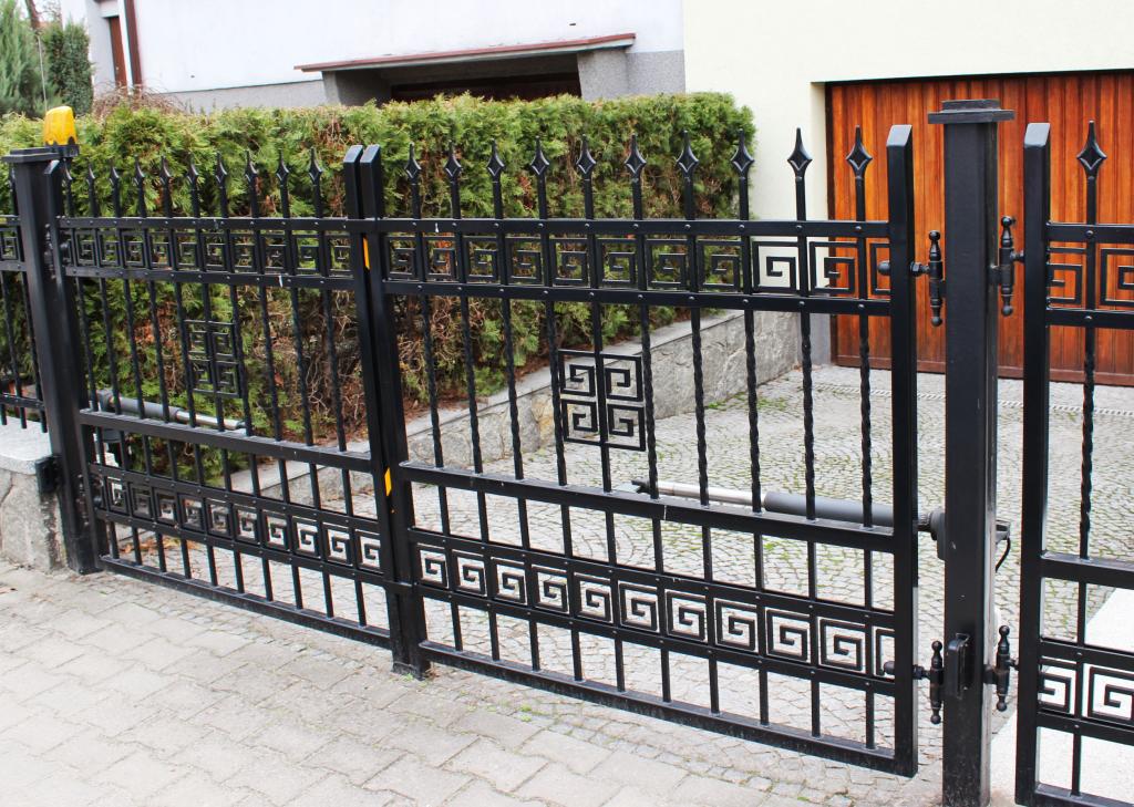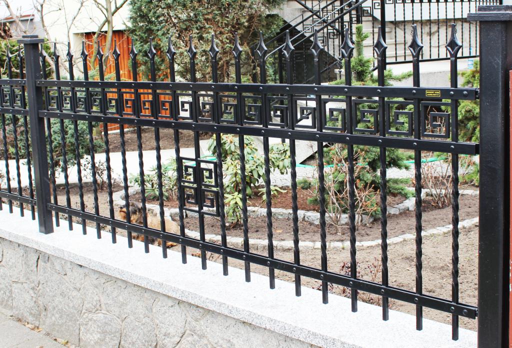 Ogrodzenie wykonano z pręta kw. 14x14, płaskownik 30x5, ozdoby: motyw grecki. Wykonany metodą nitowania, pomalowany w kolorze RAL 9005 czarny i ocynkowany ogniowo.